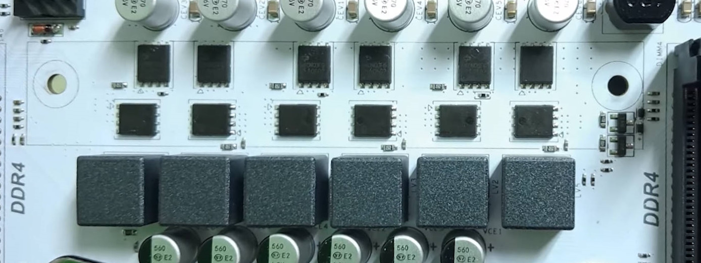 One might expect the VRM configuration to be exactly the same as well, but there was a surprise. Although it uses the classic 3×2 layout common to budget boards, in this case a uP1651 PWM controller is used along with MOSFETs from Infineon. The high side has six 060N03L MOSFETs (50 A / 6 mΩ), and the low side has six 026N03L5 MOSFETs (100 A / 2.6 mΩ). This configuration outclasses most inexpensive LGA2011‑3 boards we’ve encountered. With the active VRM cooling implemented as a small fan integrated into the heatsink and spinning at a fixed speed, the D4‑V5‑BSW can comfortably run CPUs with a TDP around 130–140 W.