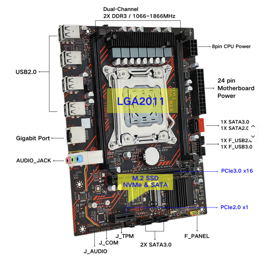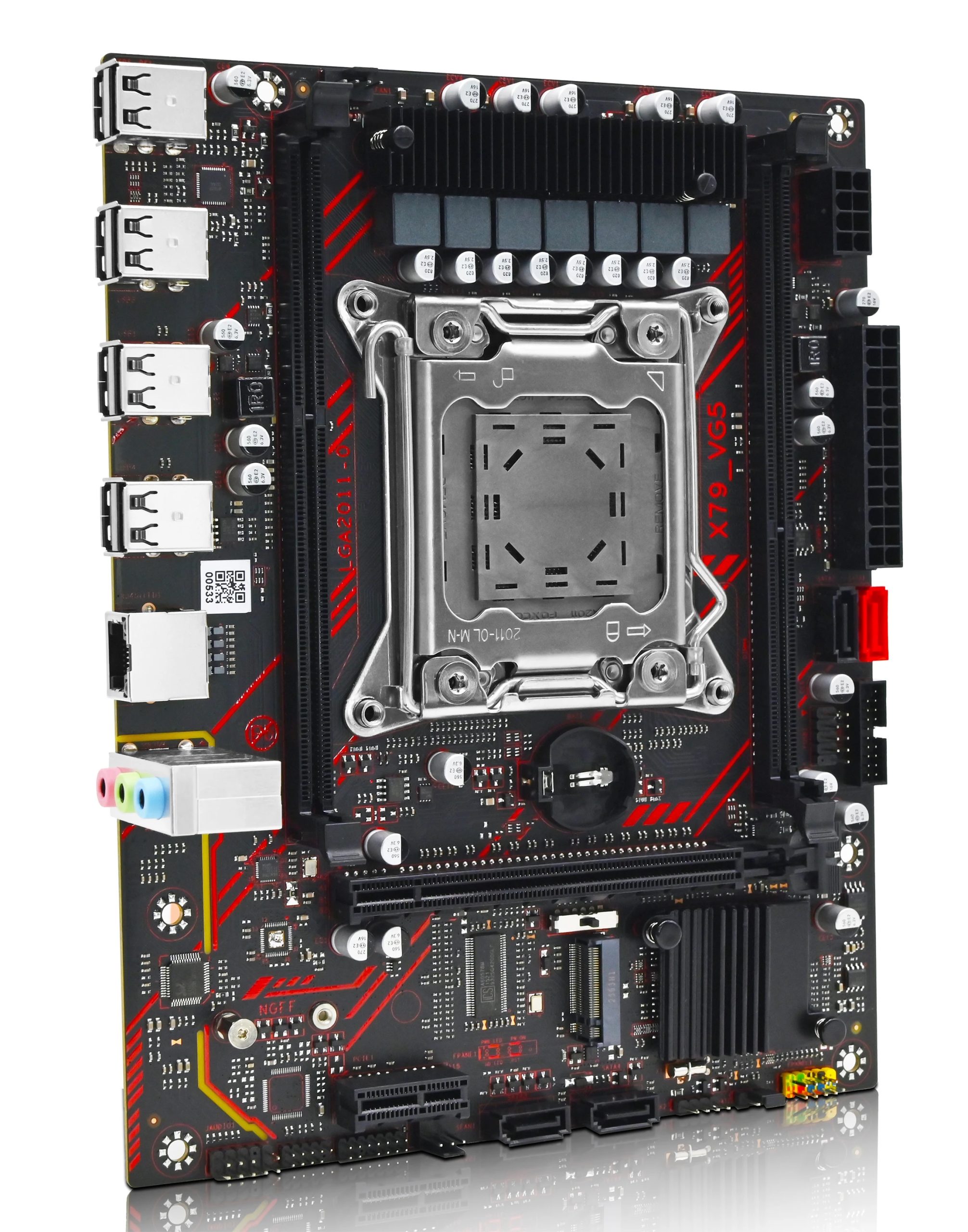 Functionally, the model is quite similar to many other budget LGA2011 boards, such as the X79G. It offers a minimal set of ports: only one SATA III (though at least there is a dual‑protocol M.2 slot), while USB 3.0 is completely absent. It features typical low‑end audio and networking chips, a standard 7‑phase power delivery system, weak heatsinks, and dual‑channel memory.